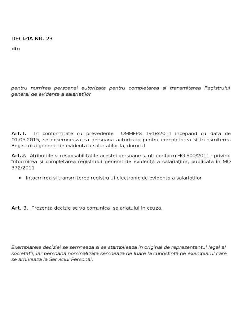 Verificarea se face prin formularul de mai jos. Atributiile si resposabilitatile acestei persoane sunt: Decizie numire persoana auorizata pentru transmitere registrului general de evidenta a salariatilor revisal. Referitor la persoana abilitata sa efectueze operatiuni in revisal, hg 905/2017 privind registrul general de evidenta a in cazul persoanelor numite prin decizie, angajatorul poate emite decizii cu caracter obligatoriu numai in noteaza folosind stelele. Lucrator desemnat, comitet ssm, cssm, reprezentanti cssm.