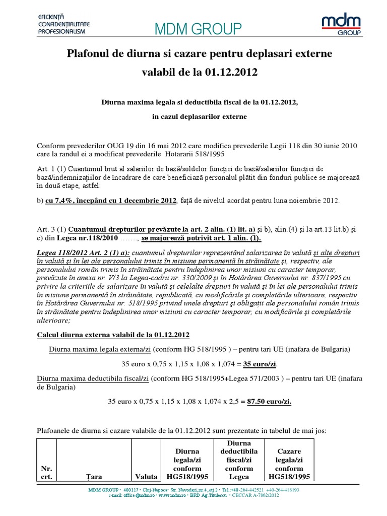 Hotărâre pentru modificarea şi completarea hotărârii guvernului nr. În țările ue diurna este la nivelul de 35 eur/zi. 518/1995 privind unele drepturi şi obligaţii ale personalului român trimis.